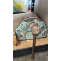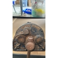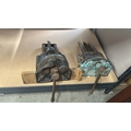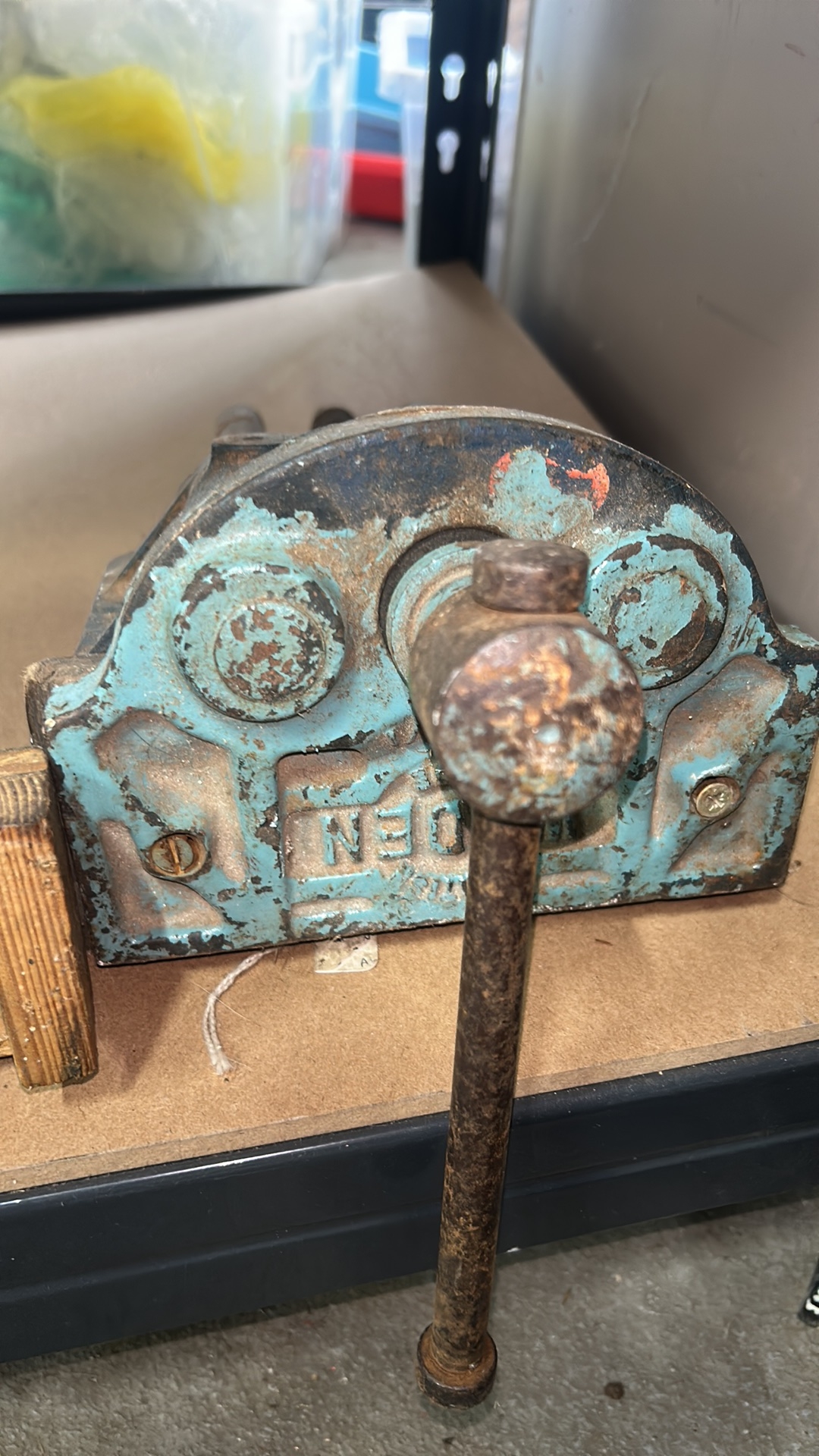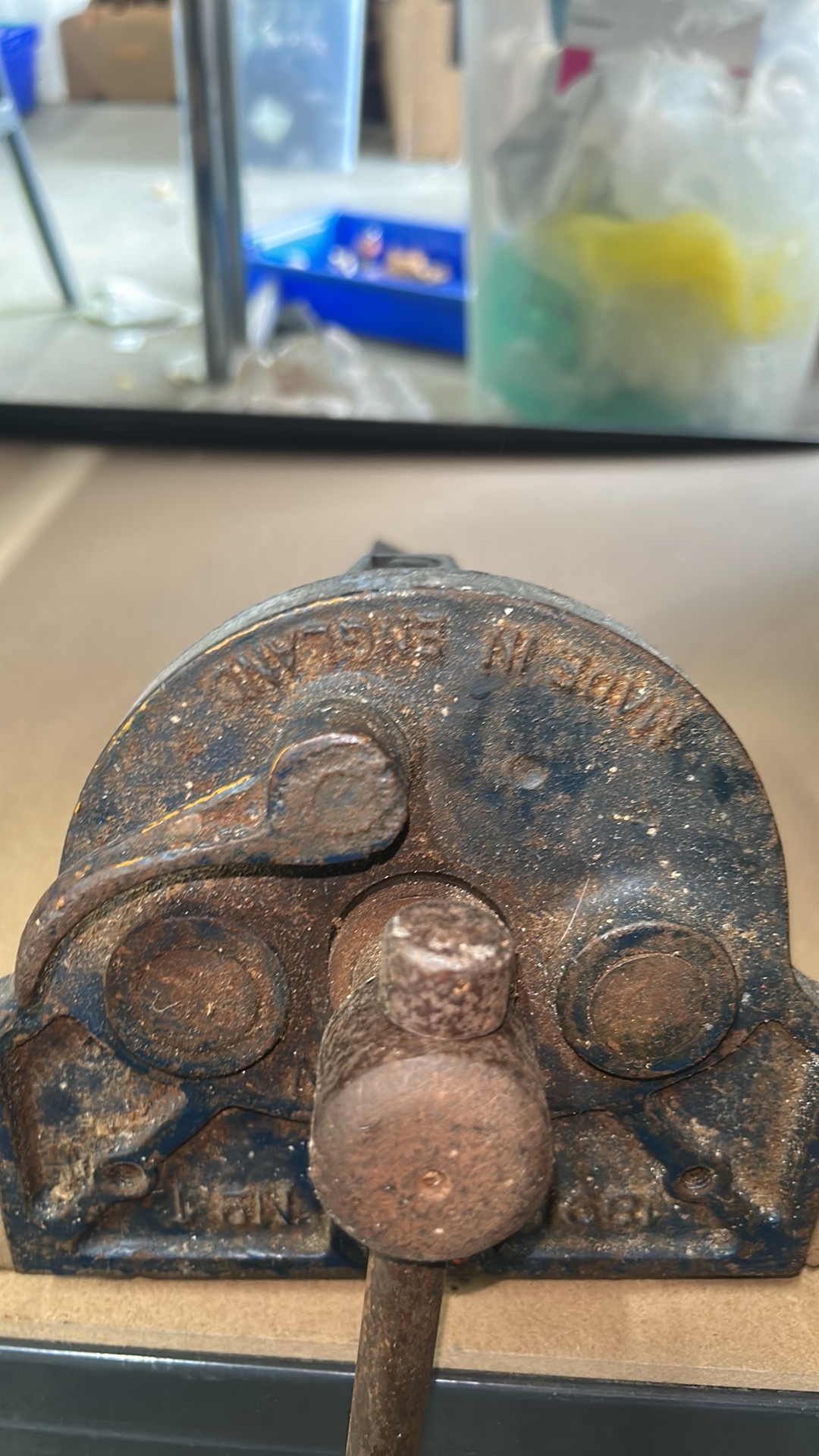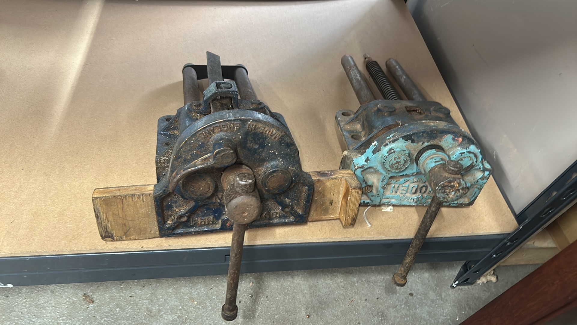 Two vintage cast iron bench vices with handles and industrial design, featuring visible casting marks.
