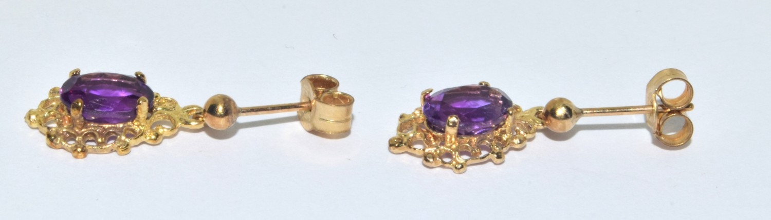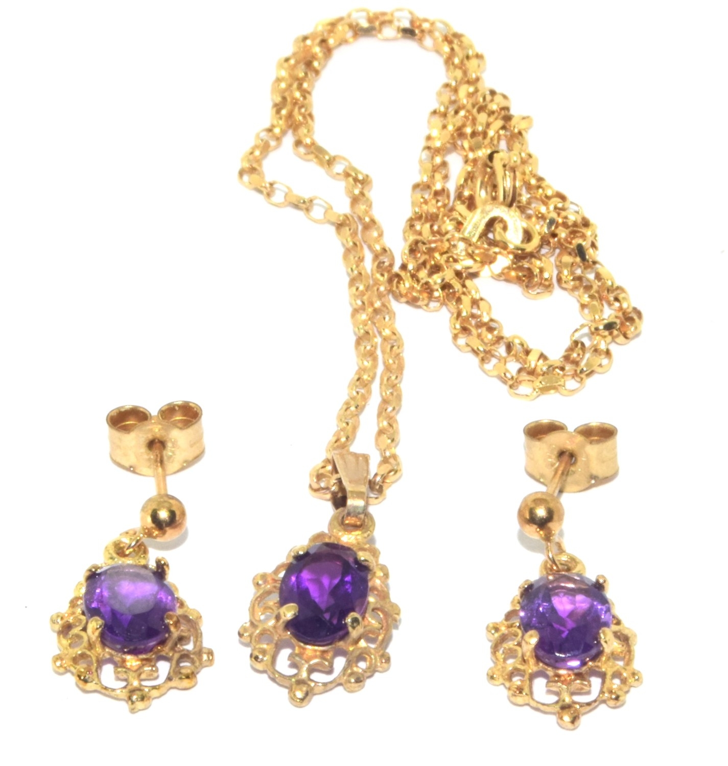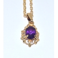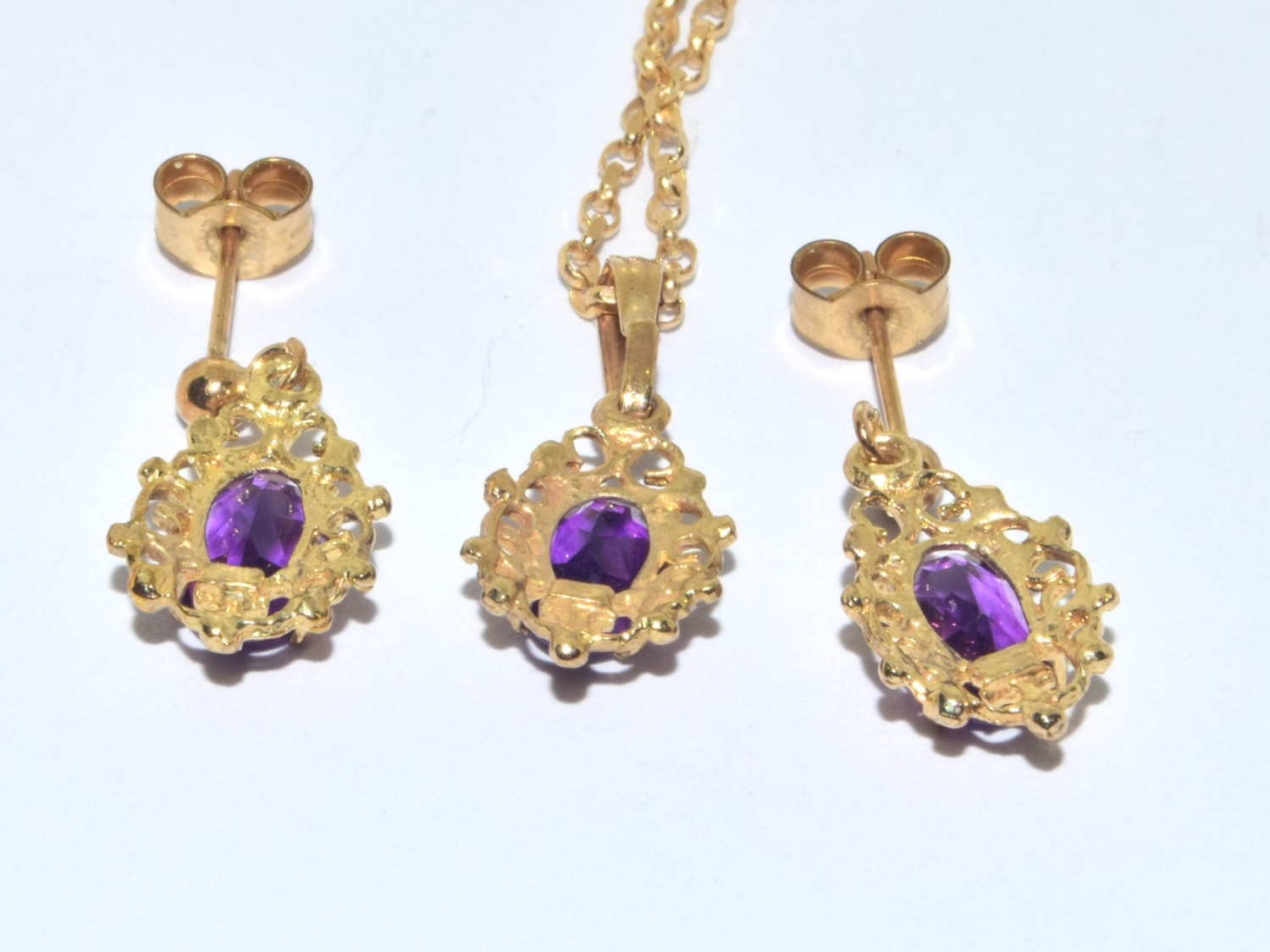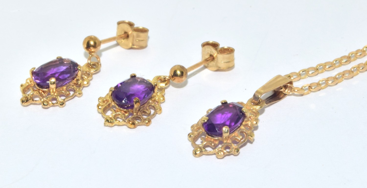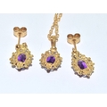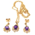9ct gold Amethyst suite of jewellery comprising an Amethyst pendant necklace on a 9ct gold chain together Amethyst drop earrings